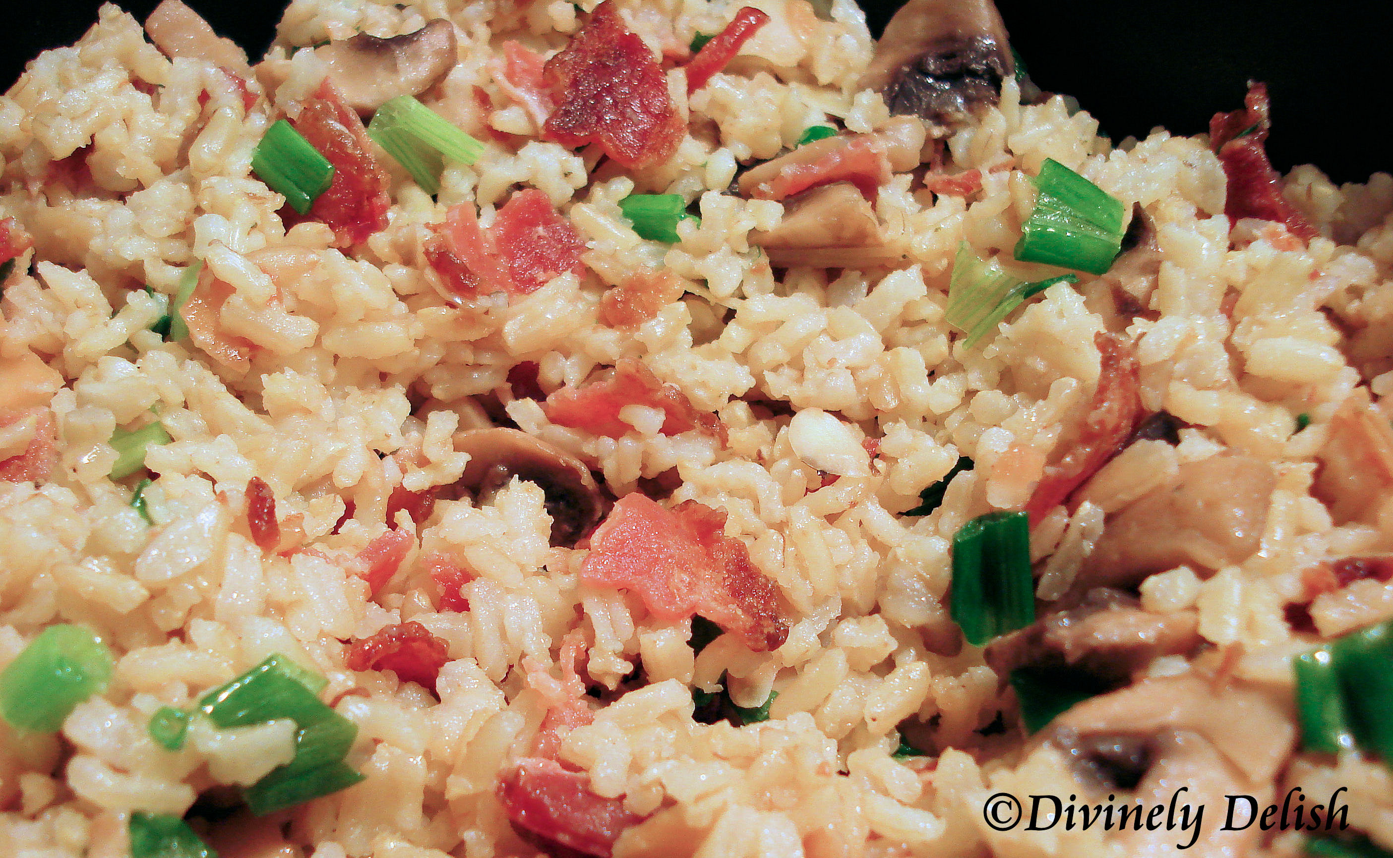 4) In a large bowl, combine cooked rice, bacon, mushrooms, cranberries, green onions and pine nuts.