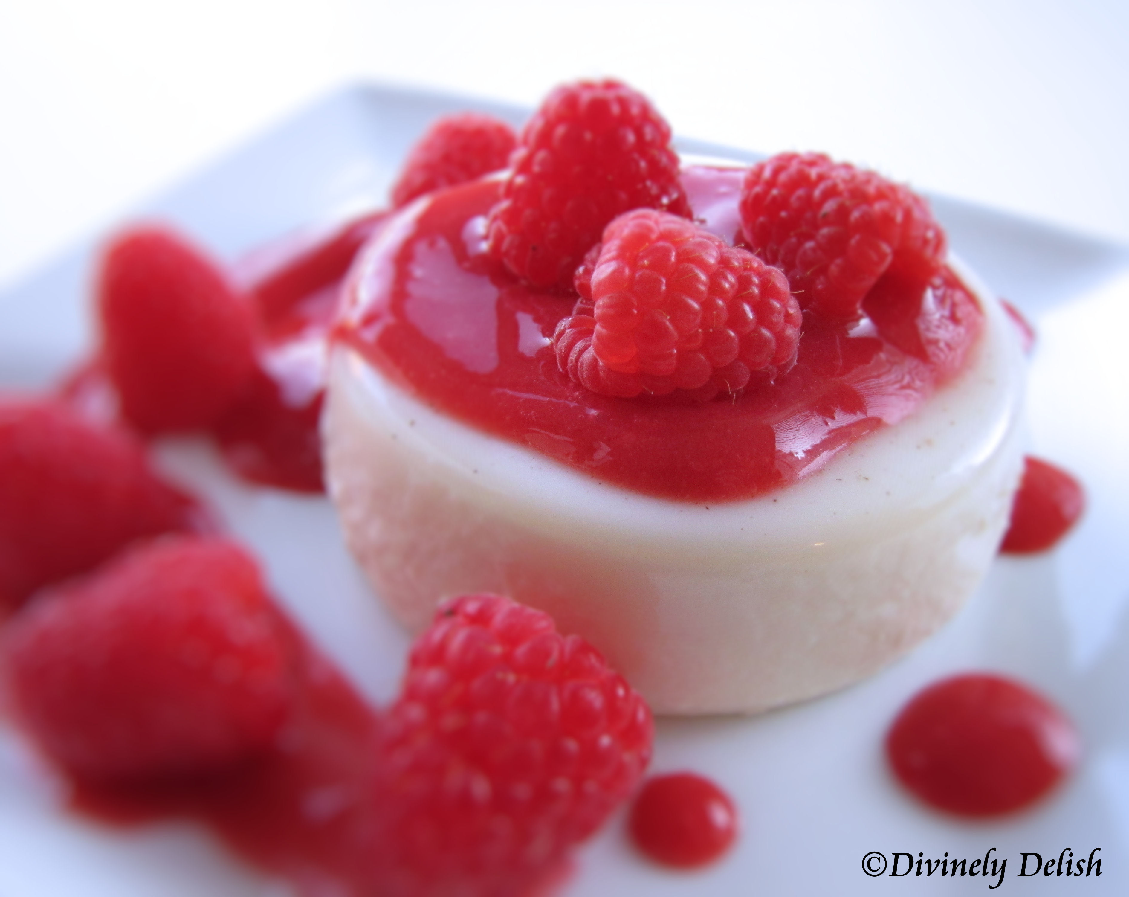 6) Run a sharp knife around the edge of each Panna Cotta and unmold each onto a serving plate, and serve with chilled Raspberry Coulis and fresh raspberries.
