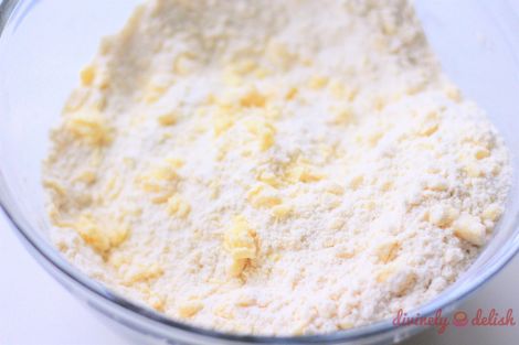 Mix the chunks of cold butter into the mixture of dry ingredients by using a pastry blender or use your fingertips to rub in the butter until you get pea-sized lumps.