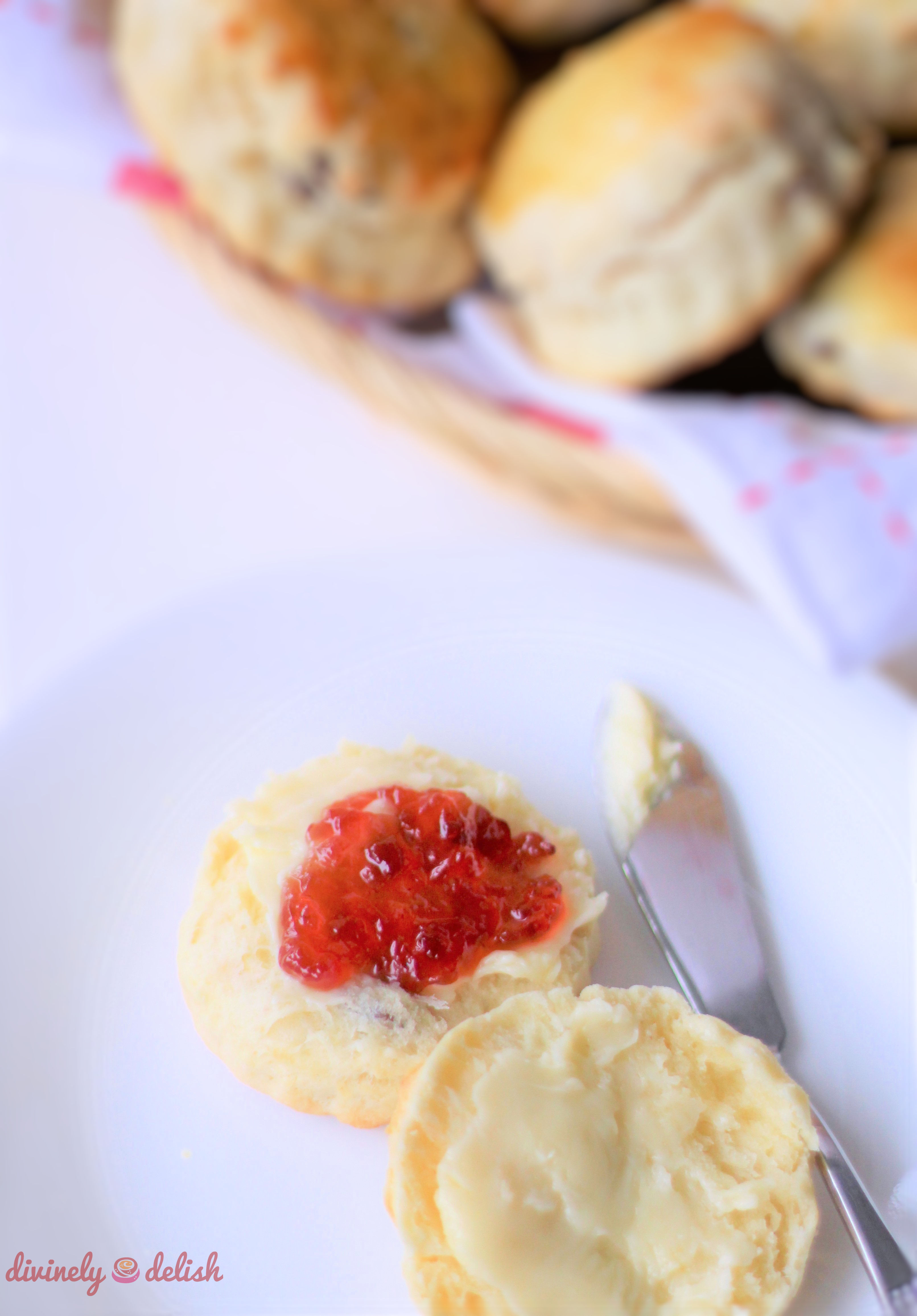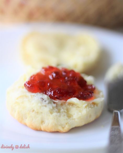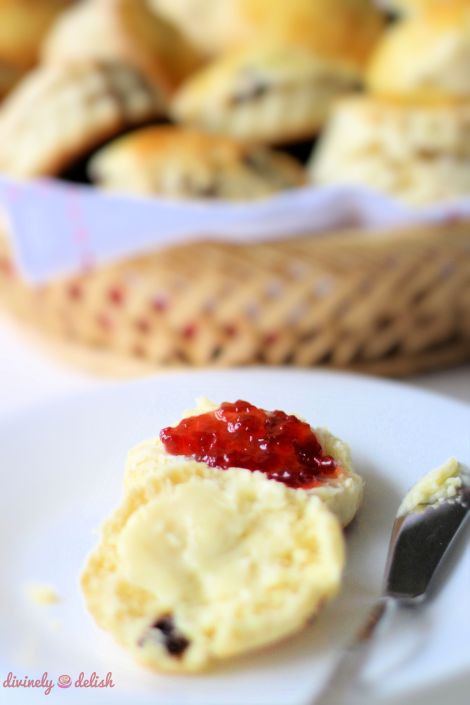 Scones are the quintessential British tea time treat, traditionally served with clotted cream and jam. They’re best eaten warm. I like to enjoy mine with butter and strawberry or raspberry jam. This time however, I had just finished my strawberry jam, so I spread on some Sangria Jelly (jam). Sound yummy? Oh, it was divine!