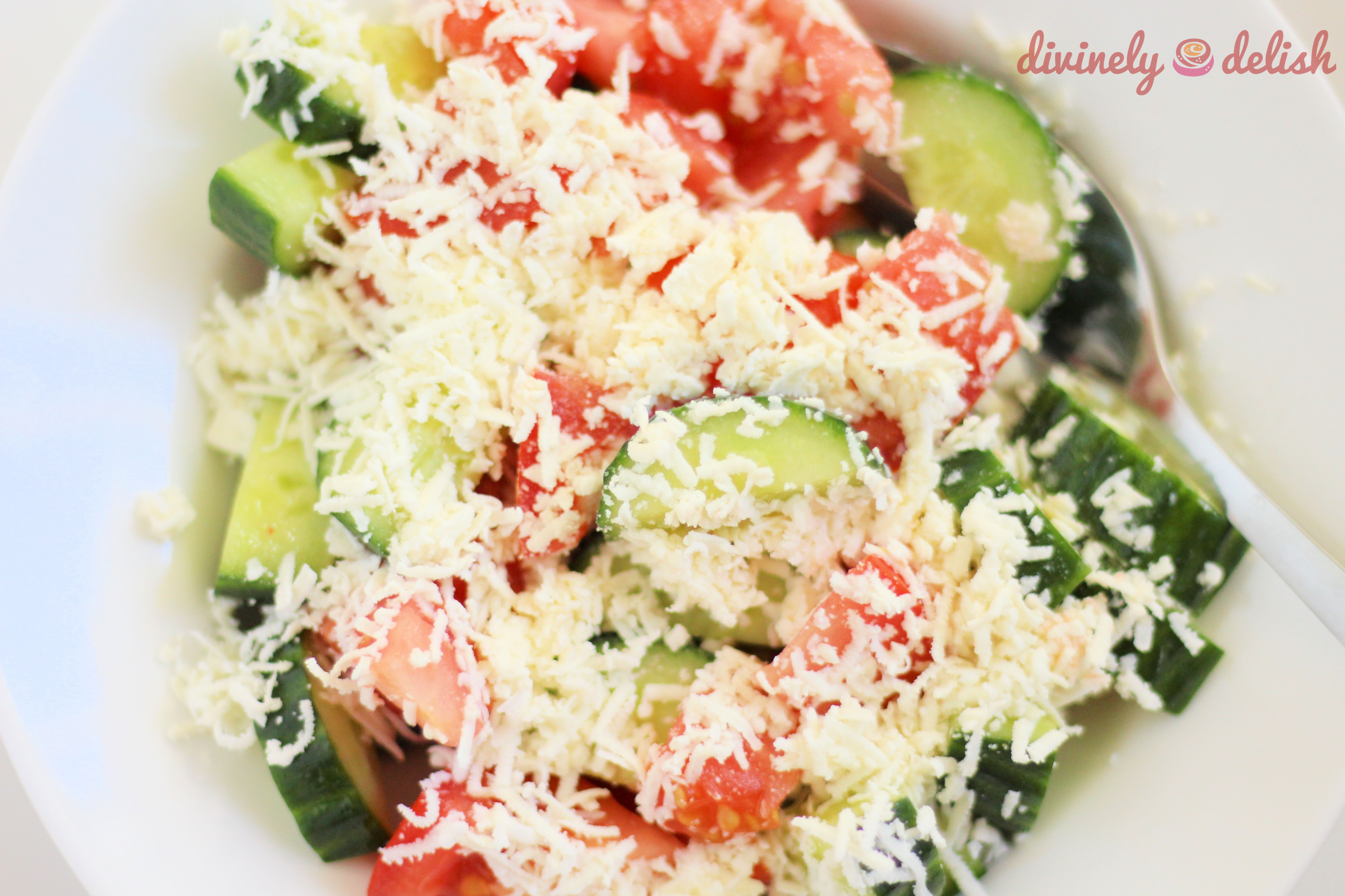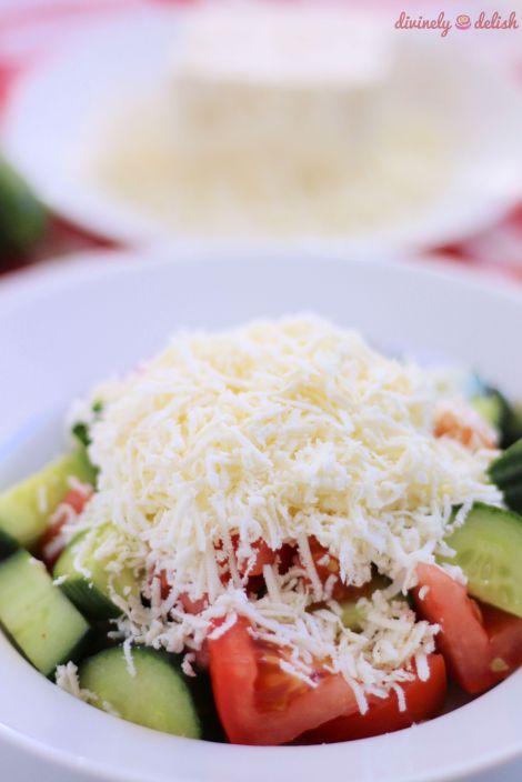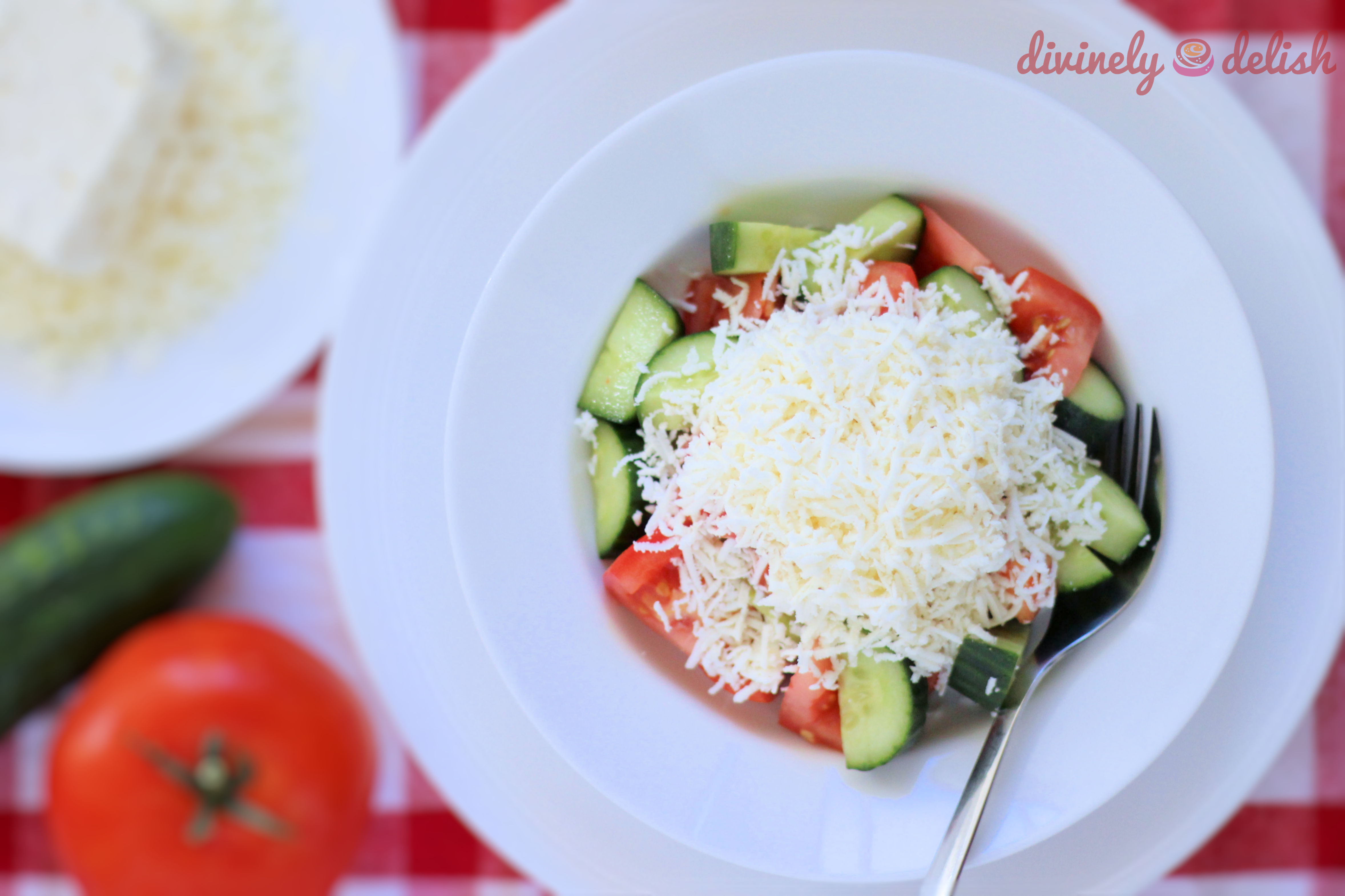 All I can say is, regardless of the origins, this is a really yummy salad! When I tried this at a restaurant in Skopje, I wasn’t expecting anything extraordinary. I mean, I’ve had lots of similar types of Greek salads with tomatoes, cucumbers and feta. But this was something else! Maybe it was the generous amount of cheese, or just the cheese itself. The combination of the sweetness and juiciness of the tomatoes, crisp and fresh cucumbers and slight saltiness of the cheese made this just the best tasting salad. And it’s perfectly refreshing too, especially in 35C weather!