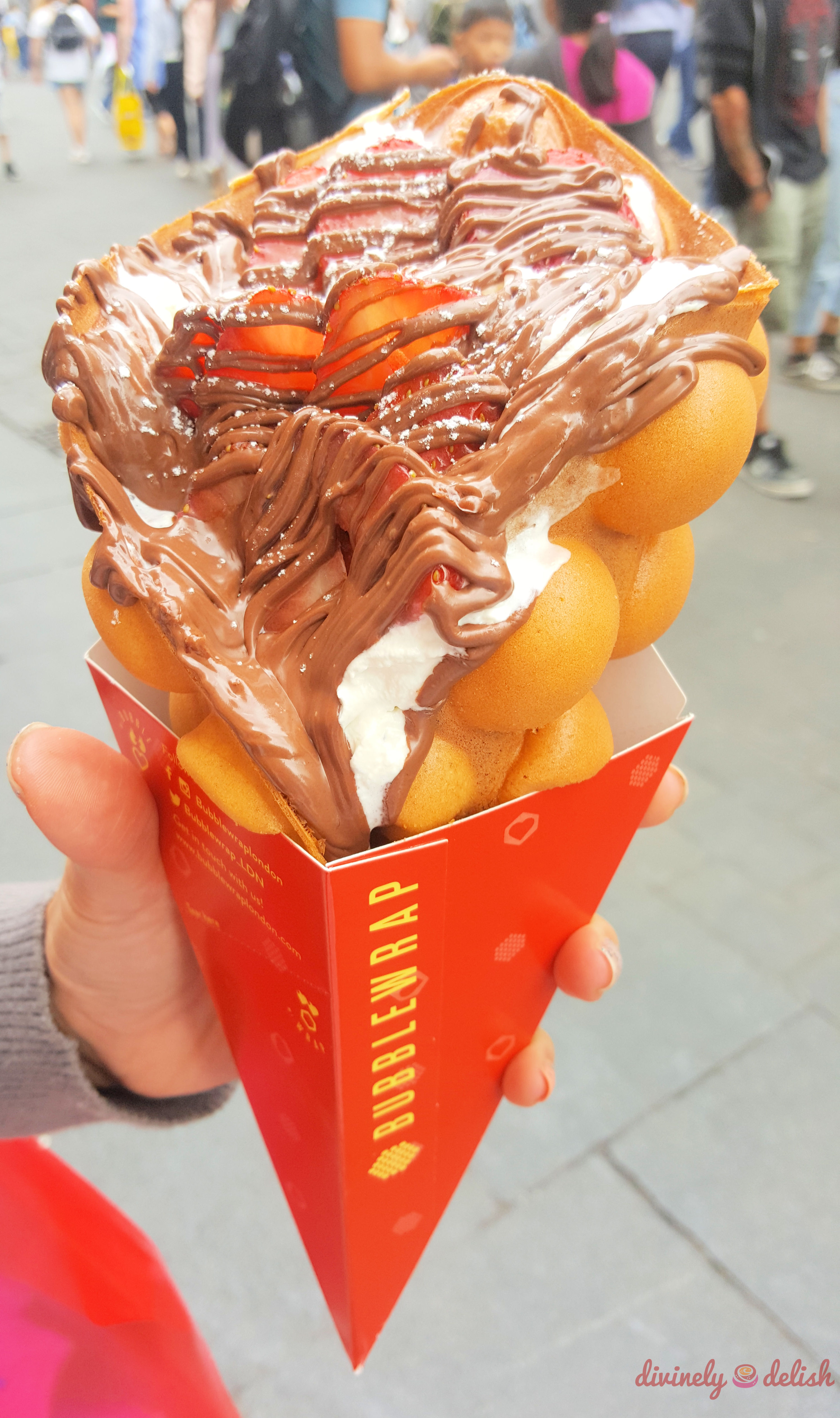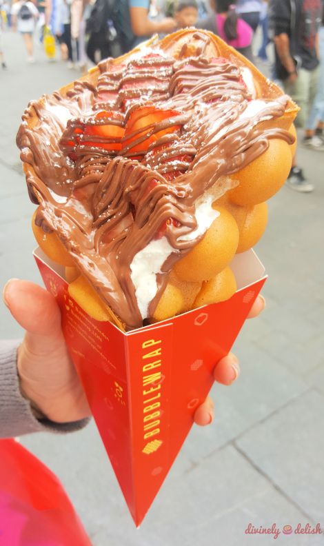 While in Chinatown, I saw a long lineup of people outside Bubblewrap Waffle. The ones who’d gotten their orders walked out with these huge, decadent-looking waffle wraps filled with fruit, ice cream, chocolate and whatever else. I wouldn’t normally eat something like this, but it’s different when you’re a tourist. So I, too, joined the line and got myself dessert to start the day!