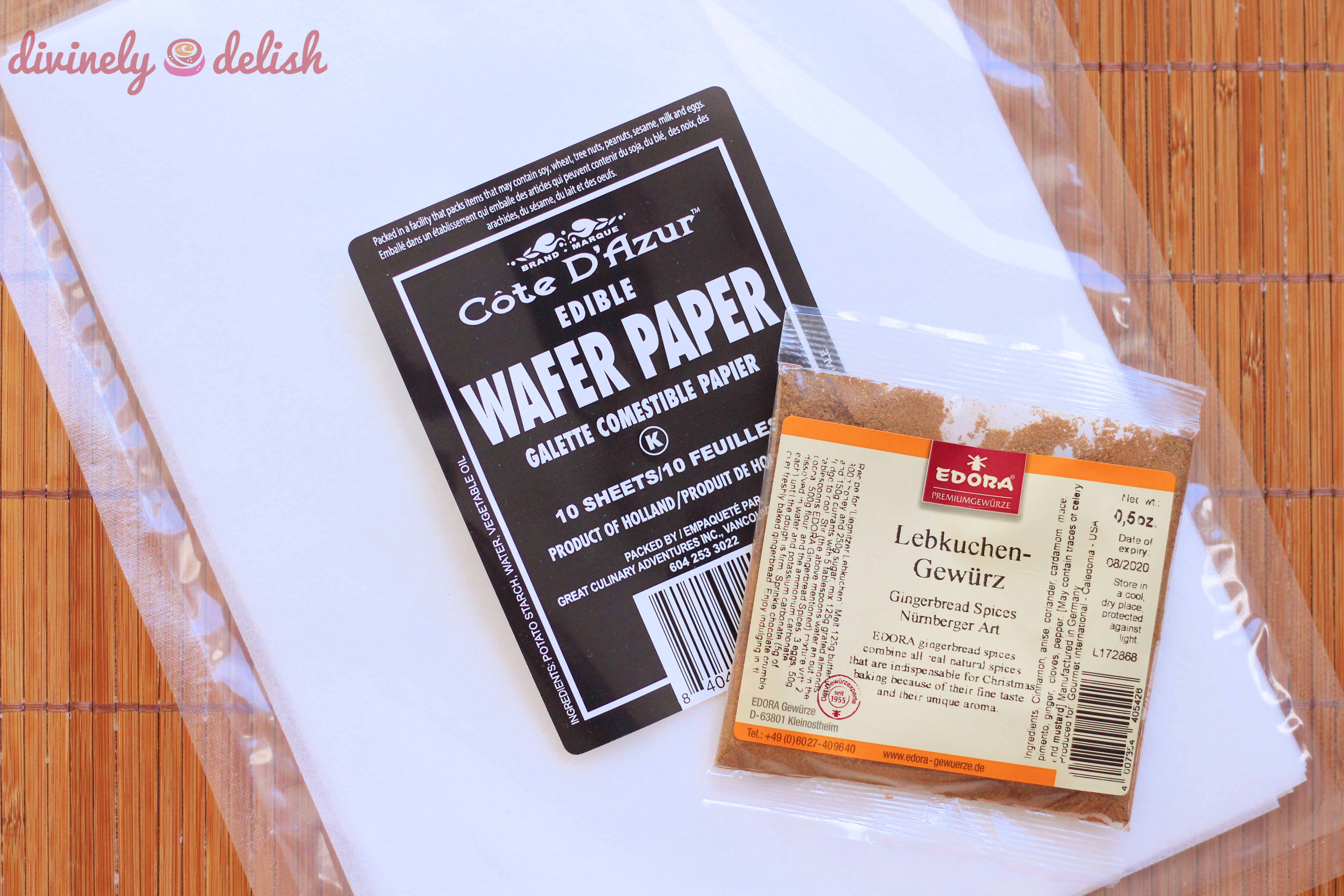 Prior to making these, I was shopping for panettone molds and came across packets of ready-made lebkuchen spice, so I didn’t actually blend the spices myself! [Update: I’ve since made many batches of lebkuchen using this recipe for my lebkuchen spice blend]. I also found large rectangular wafer paper, and assumed they must be similar to Oblaten wafers, which are small round pieces of edible wafer paper.