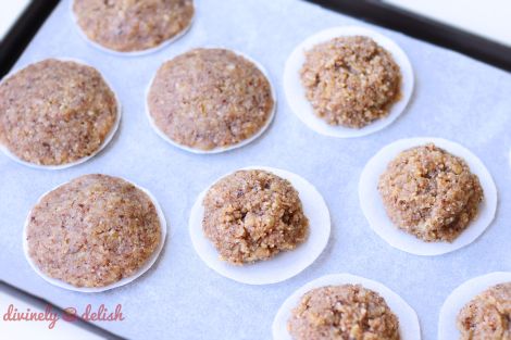 4. Using the back of a wet spoon, knife, or spatula, flatten the dough evenly all around the Oblaten and until the very edge of the wafer (the dough will barely spread in the oven), trying to ensure that the dough is a little bit thicker in the centre of the Oblaten and becomes thinner closer to the edge of the Oblaten. If you want, lightly press 3 almond halves onto the top of each cookie. Arrange them with the tips towards the centre and spaced evenly apart (as per the original recipe, I actually stuck them on at the end, after glazing, but I found that they did not stay on very well, and had to brush more glaze over the almonds to help them stick on).