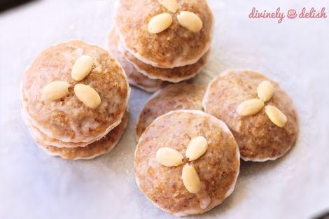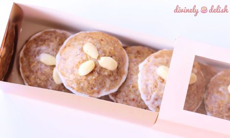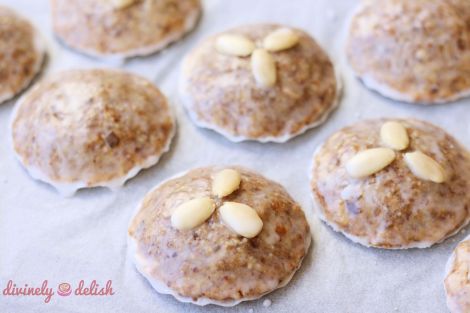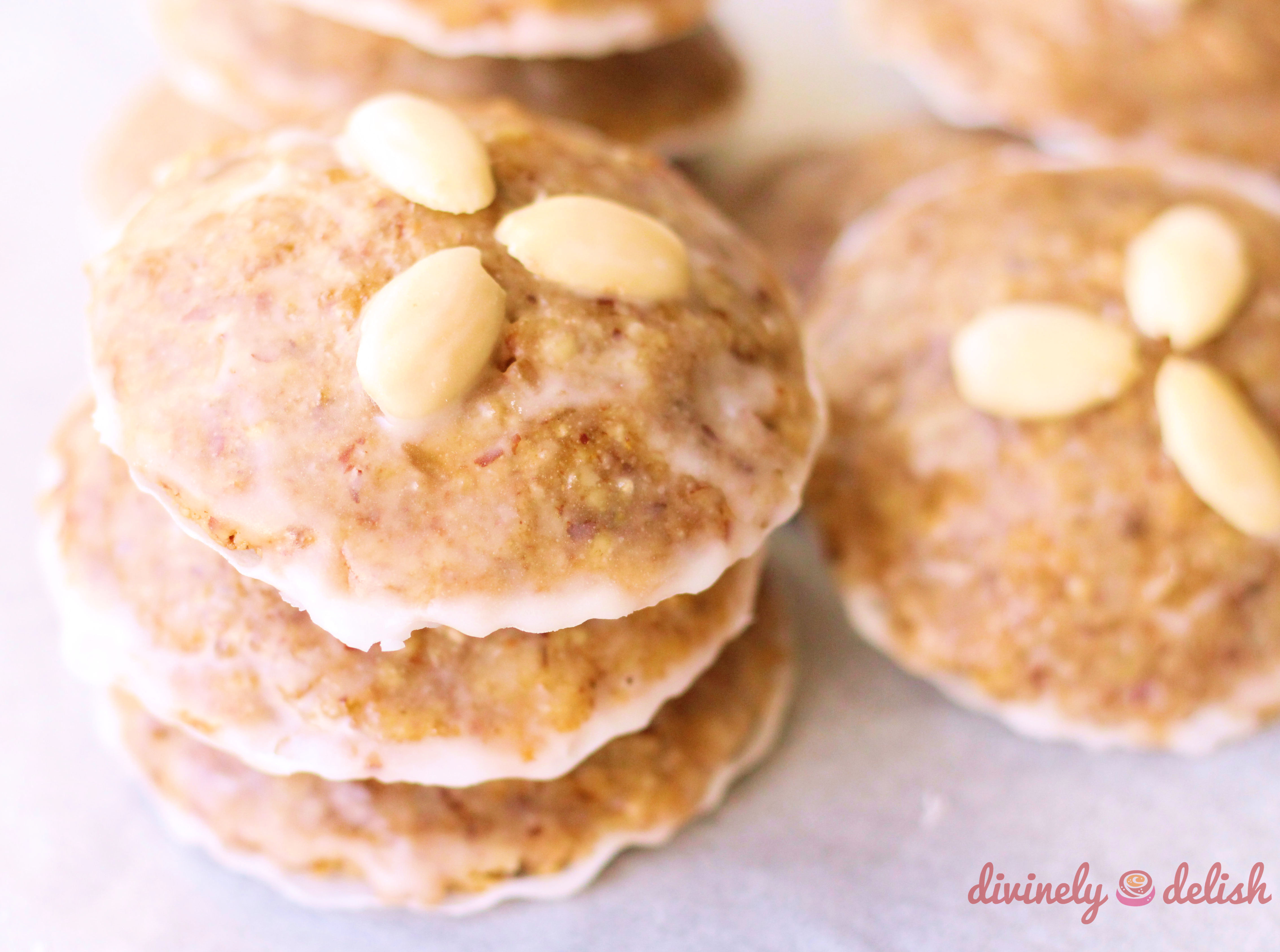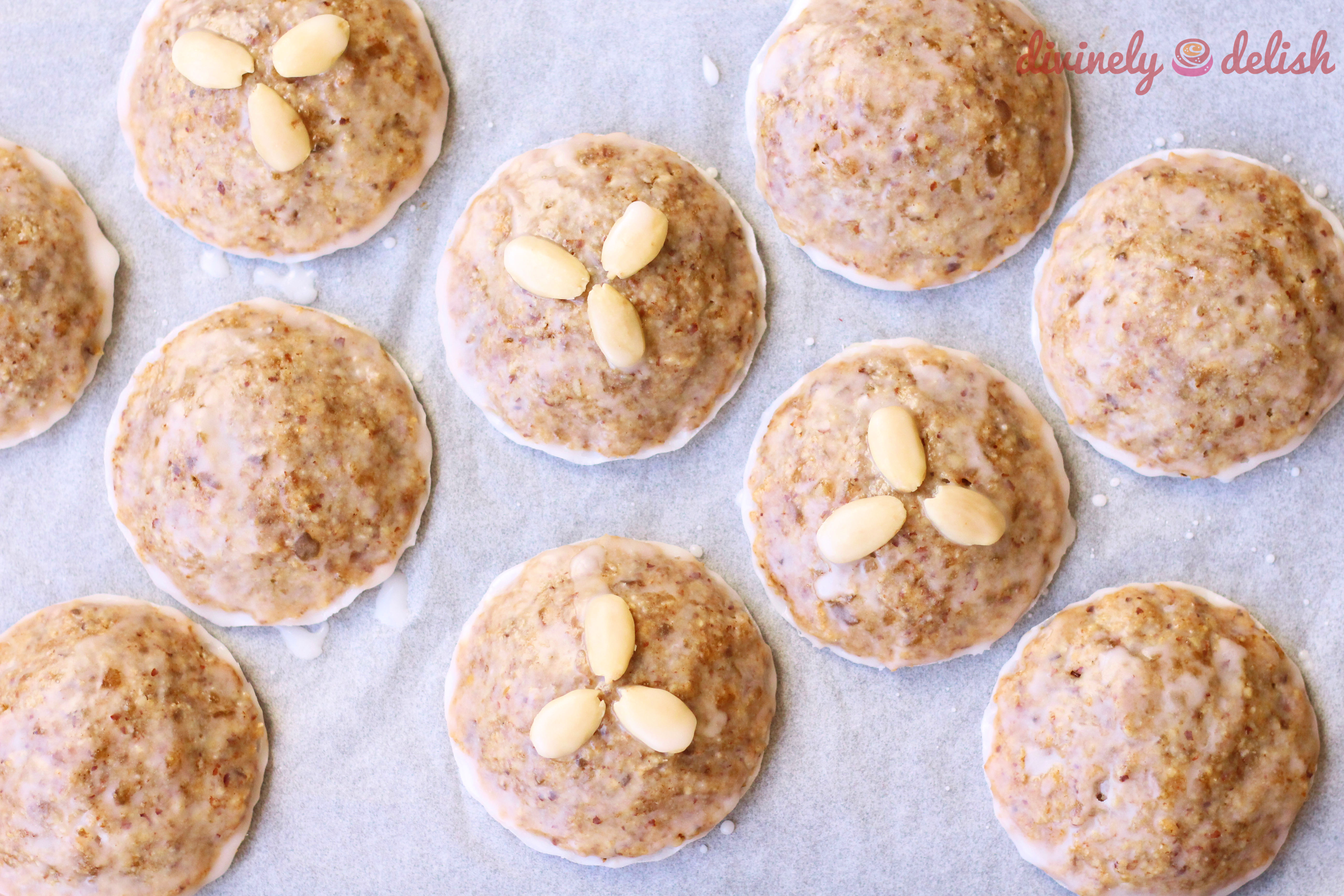 6. While they’re are cooling, prepare the glaze by whisking 2 to 3 tablespoons of water into the icing sugar until you have a thick but pourable glaze. Using a pastry brush, spread a thin layer of glaze over the Elisenlebkuchen. Place the freshly glazed cookies on a cookie rack set atop some parchment paper to catch any excess glaze and wait for the glaze to harden.