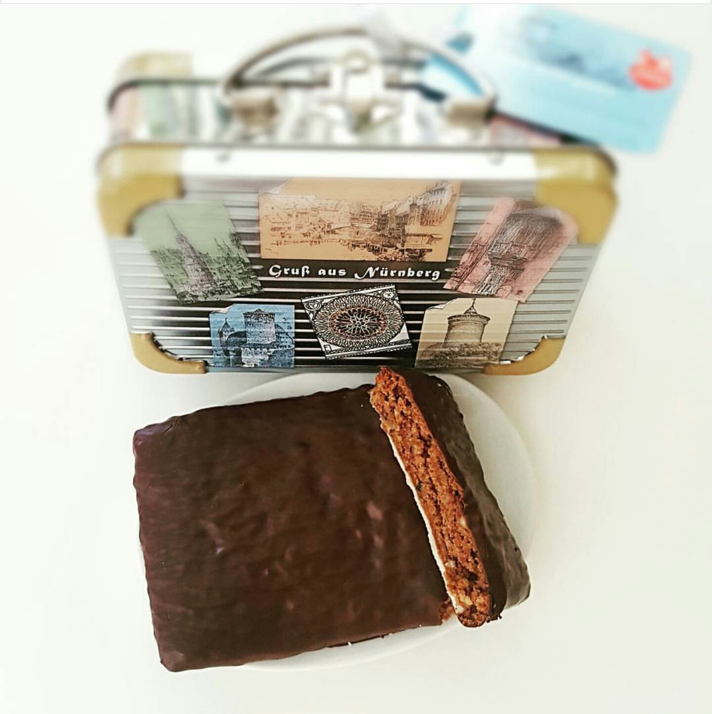I’d never even heard of lebkuchen until 3 months ago when I took a detour from Prague to Nuremberg (Nürnberg) to visit a friend, on my way to Berlin. My friend’s husband, who is German, told me that Nuremberg is famous for lebkuchen, and suggested I buy some to take home. So after a hearty meal of Nürnberger sausages and sauerkraut, we went into Lebkuchen Schmidt, where they had various lebkuchen and other confections. It didn’t take me long to decide what to buy, however, because a bunch of colourful little tins in the shape of suitcases, displayed on the counter behind the salesperson, soon caught my attention. I’m a total sucker for cute, miniature things! I decided right away that that was what I wanted, even before I knew what was actually inside or how much it cost! It turned out to be a tin of 2 rectangular pieces of chocolate covered lebkuchen, which my friend said is actually her favourite kind. So I paid something like 10 Euros for one and left the store with lebkuchen and my lovely souvenir tin!