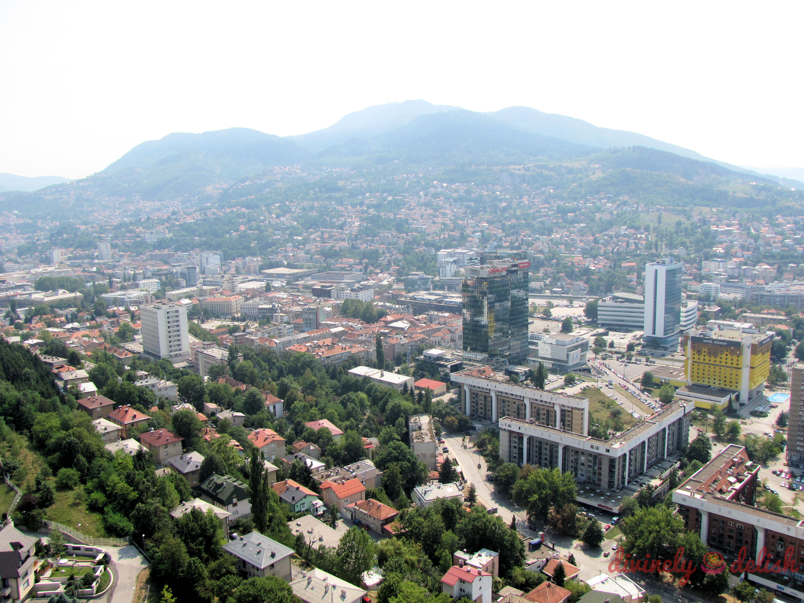 View of Sarajevo from the Avaz Twist Tower. The yellow building on the right, Hotel Holiday, was the former Holiday Inn, where journalists holed up during the Bosnian War.