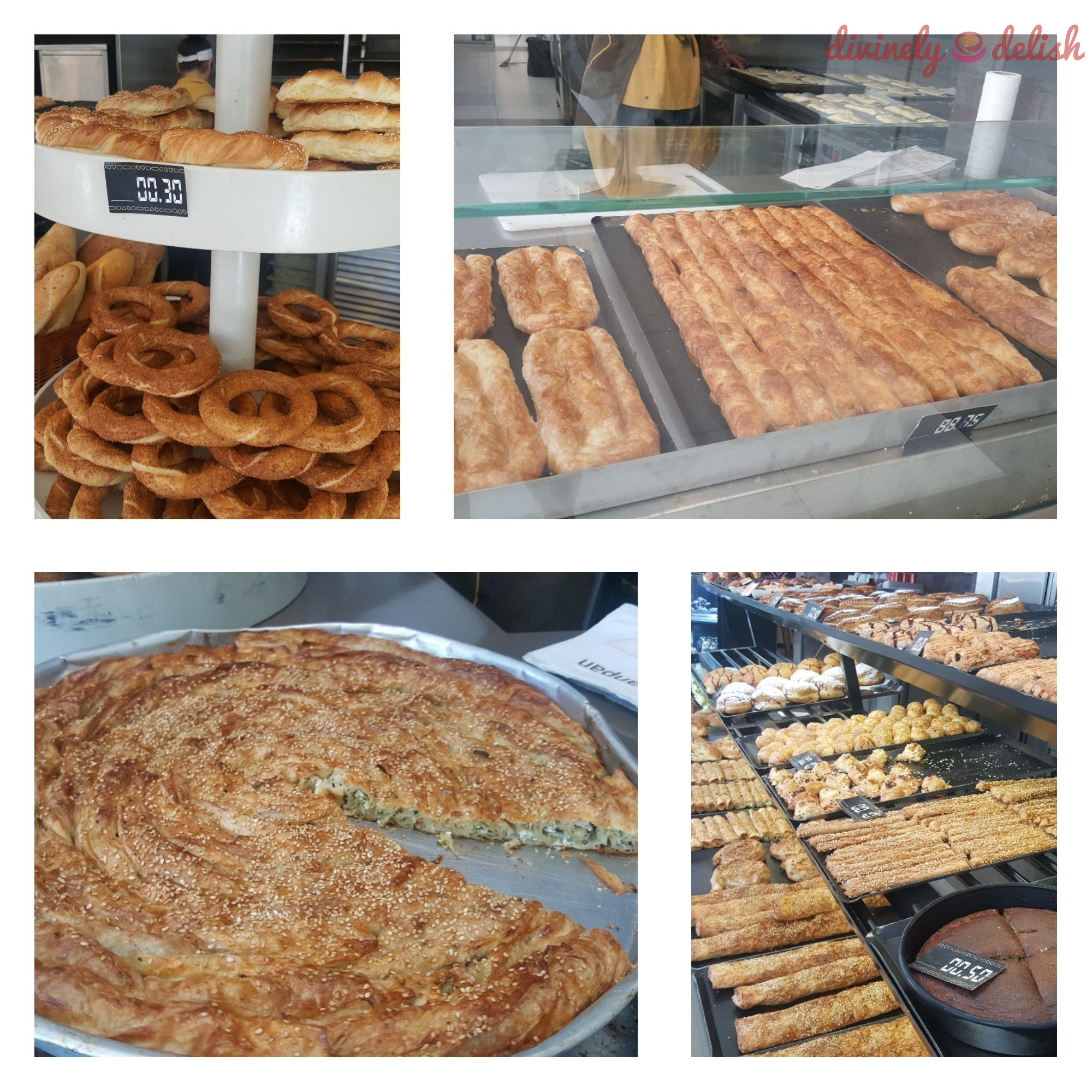 I love visiting bakeries! Top left: I recognized the simit (Turkish “bagels”) which I had eaten in London. Bottom left: Burek
