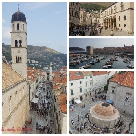 Left: view of Stradun from the city walls; Top right: Rector’s Palace (Cultural History Museum); Middle right: Harbour in the Old Town; Lower right: Big Onofrio’s Fountain