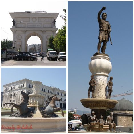 Top left: Porta Macedonia, completed in 2012, shortly after the 20th anniversary of Macedonia’s independence; Right: Philip of Macedonia statue