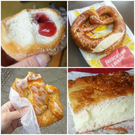 Top left: Berliner Pfannkuchen (“Berliner”), similar to the Polish jam-filled paczki; Top right: Pretzel; Bottom left: Marzipan brezel; Bottom right: Bienenstich