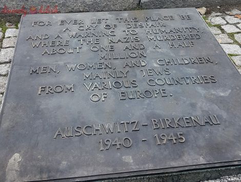 Inscription in English (one of many languages) on a plaque at the International Monument at Birkenau