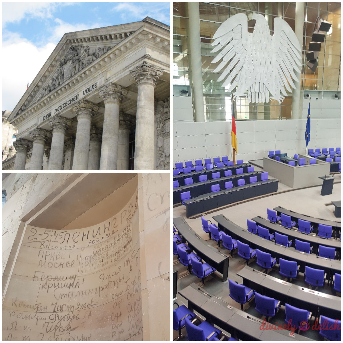 The exterior of the Reichstag building; the debating chamber of the Bundestag; graffiti on the wall left by Russian soldiers when they seized the building in May of 1945