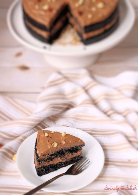 The buttercream is a Swiss meringue buttercream, which is softer, lighter and much less sweet than American buttercream – perfect for me, because I can’t stand sickeningly sweet frostings. I personally prefer more of a buttery, ever so lightly sweetened taste. The only change I made to this recipe was adding 50% more nutella. That sounds like a lot (not that anyone would complain!), but even then, the nutella taste was still pretty subtle, and not too sweet. On its own (yes, I had a few spoonfuls before I stopped myself), the buttercream was perfect. However, with the cake, which was also not very sweet, I thought it lacked some sweetness. Next time I’m going to increase the amount of sugar and possibly try adding even more nutella! 😲 (I came across a few other Nutella buttercream recipes that used 250 grams (1-1/4 cups) of sugar to 130 grams (1/2 cup) of Nutella).