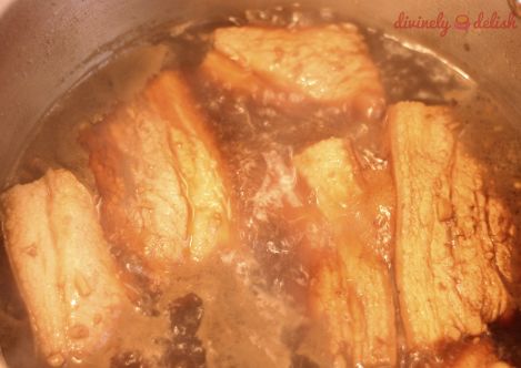 1. Heat oil in large pot over medium heat and saute the garlic until fragrant. Add pork belly, stir and cook for a couple of minutes.