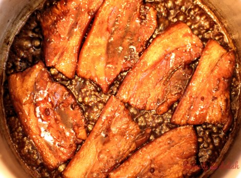 Here’s a dish that’s really easy to make and super delicious. When pork belly is braised, it just melts in your mouth! The recipe calls for gula melaka, which I buy from Malaysia. It’s a very dark palm sugar with a rich caramel flavour (you can read more about it here). Unfortunately, I don’t believe you can get gula melaka outside of Malaysia. I have seen Thai palm sugar sold in Asian supermarkets here, but I’ve never used it. It’s a very light golden colour, so I’m not sure that you would get the same deep, smoky taste, although it could surely be used as a substitute. Here’s a list of some other suggestions.