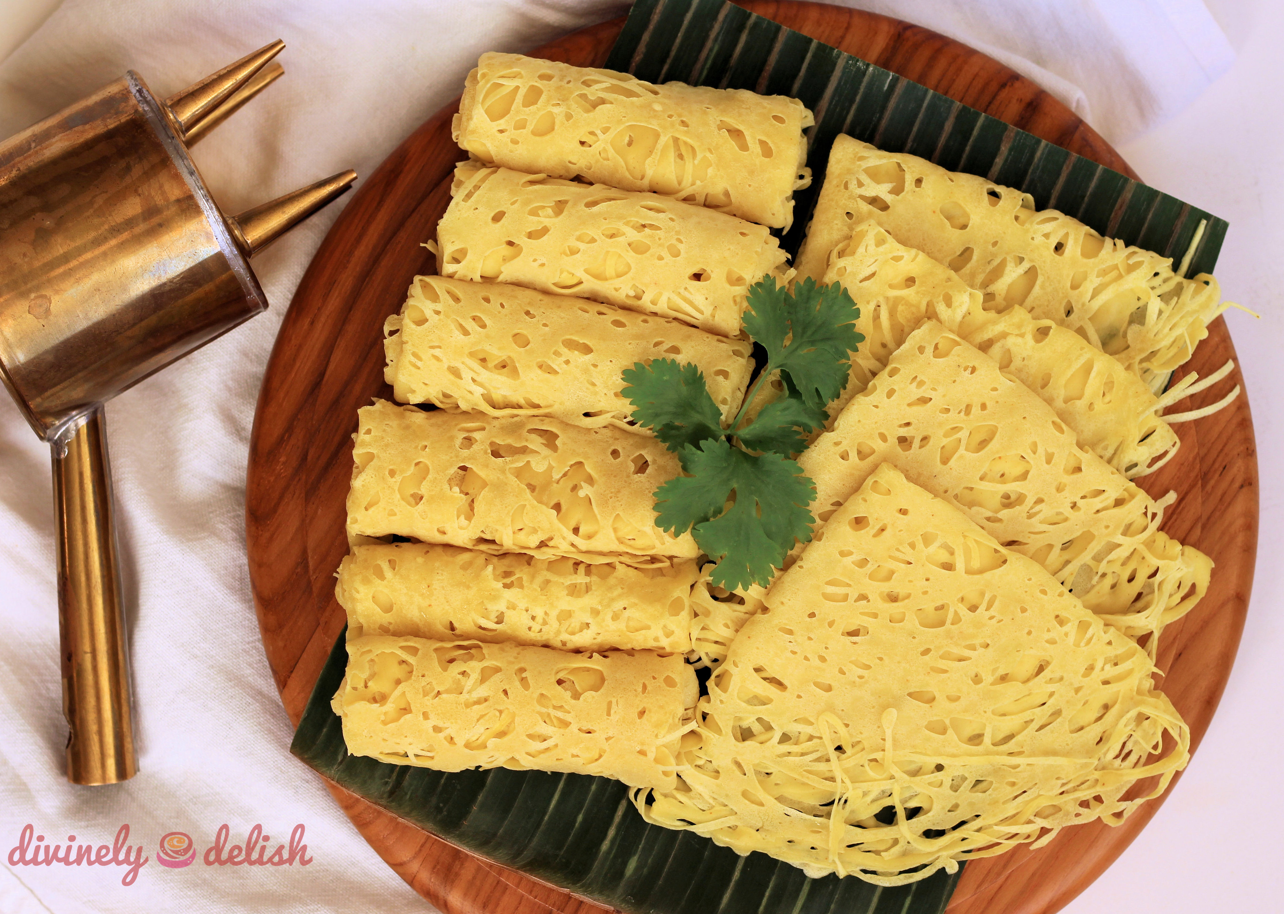 They are served rolled up like spring rolls, or folded into quarters, and are excellent eaten with curries. The net-like crepes are great for sopping up sauces and are a nice alternative to rice!