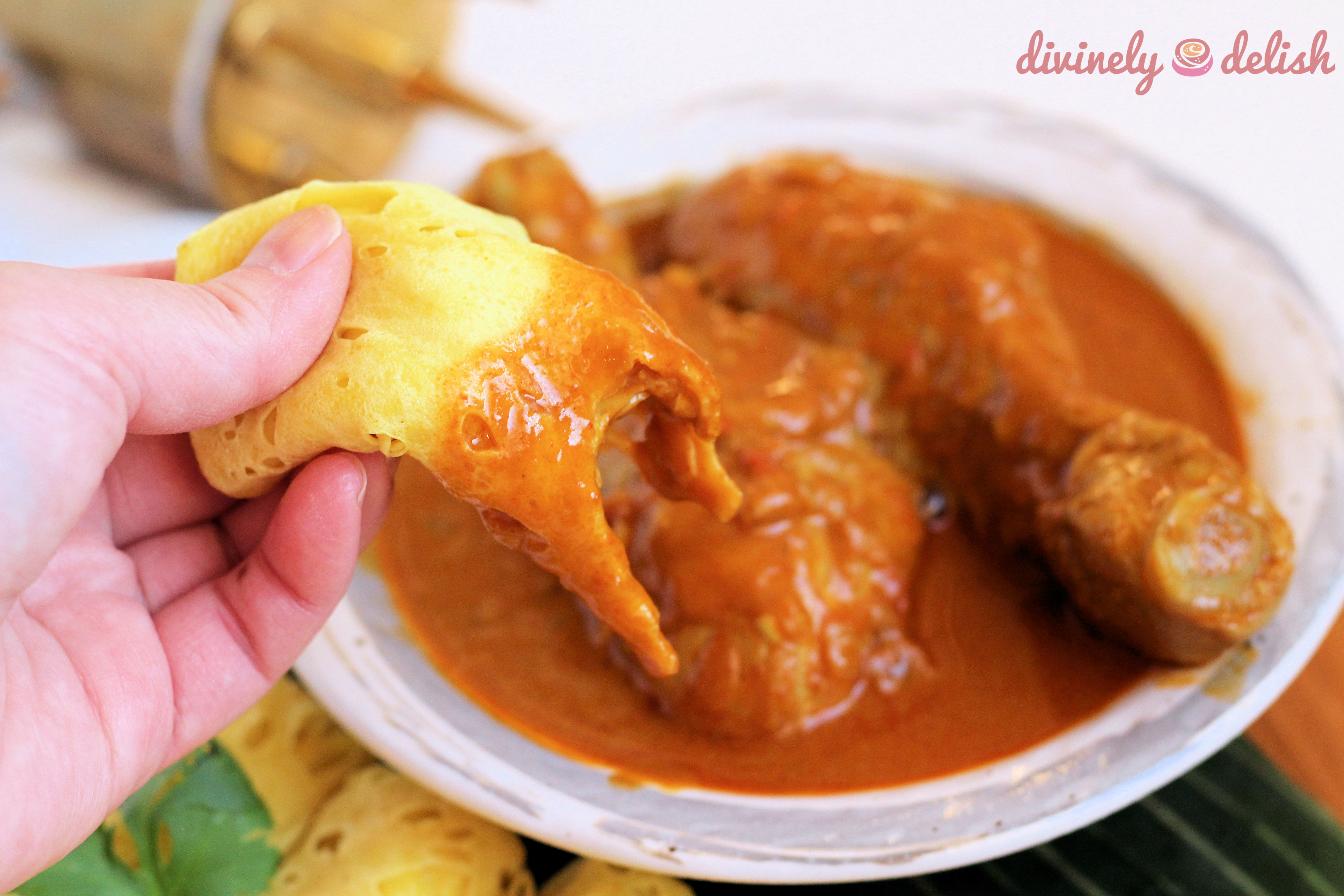 I hadn’t made Roti Jala in a long time, but decided to recently, when I cooked some chicken curry. I could also finally use my mother’s old Roti Jala funnel that I’d found while digging through her kitchen cupboards last year. It’s one of the traditional brass ones which aren’t so commonly seen nowadays, so I feel pretty lucky to have in my possession this piece of antique! Nowadays, you’re more likely to find plastic ones. If you don’t have this utensil, you can just improvise and use a squeeze bottle, like what I used to do.