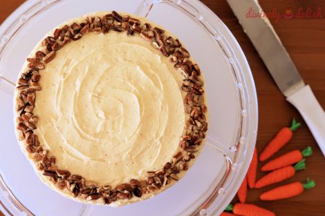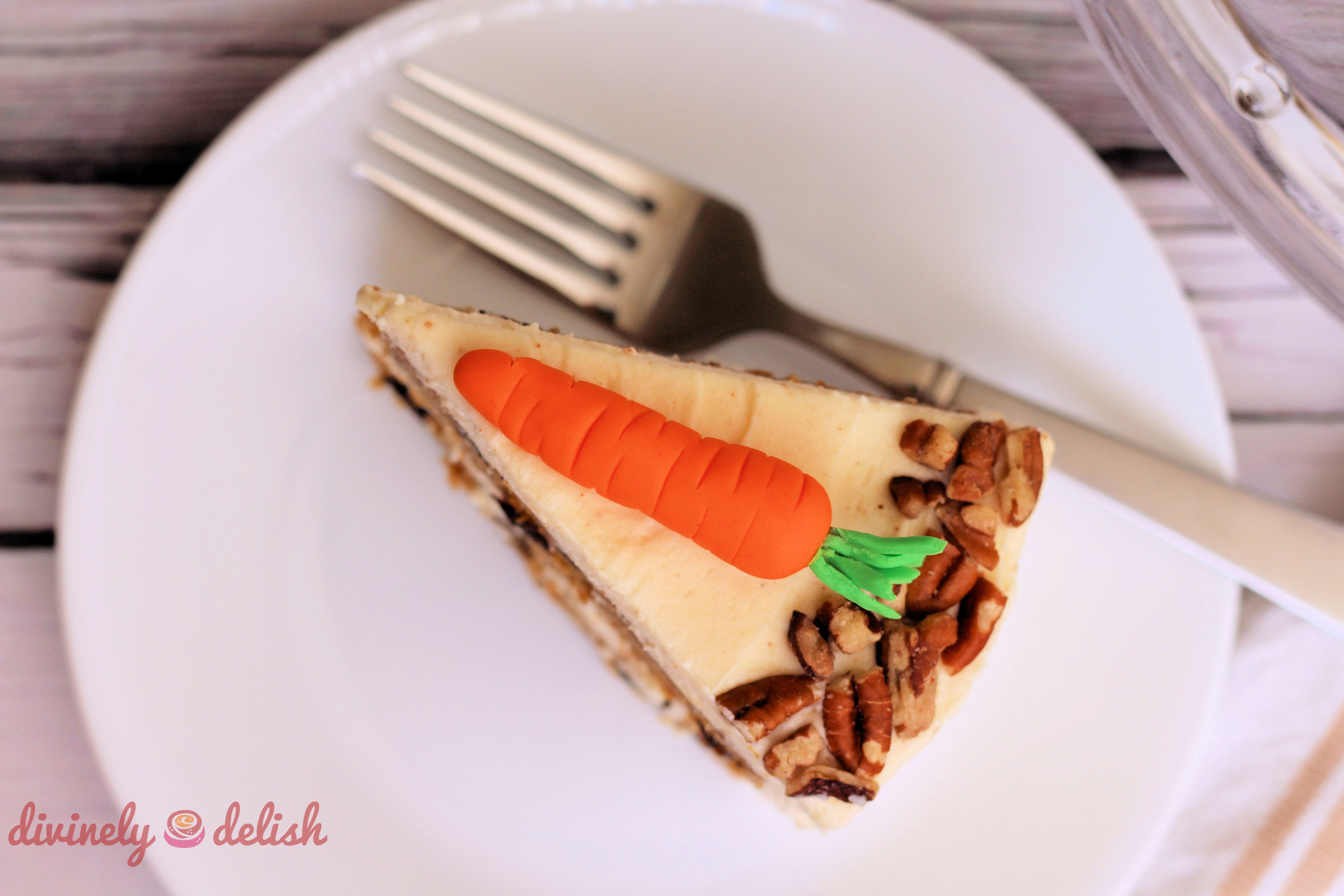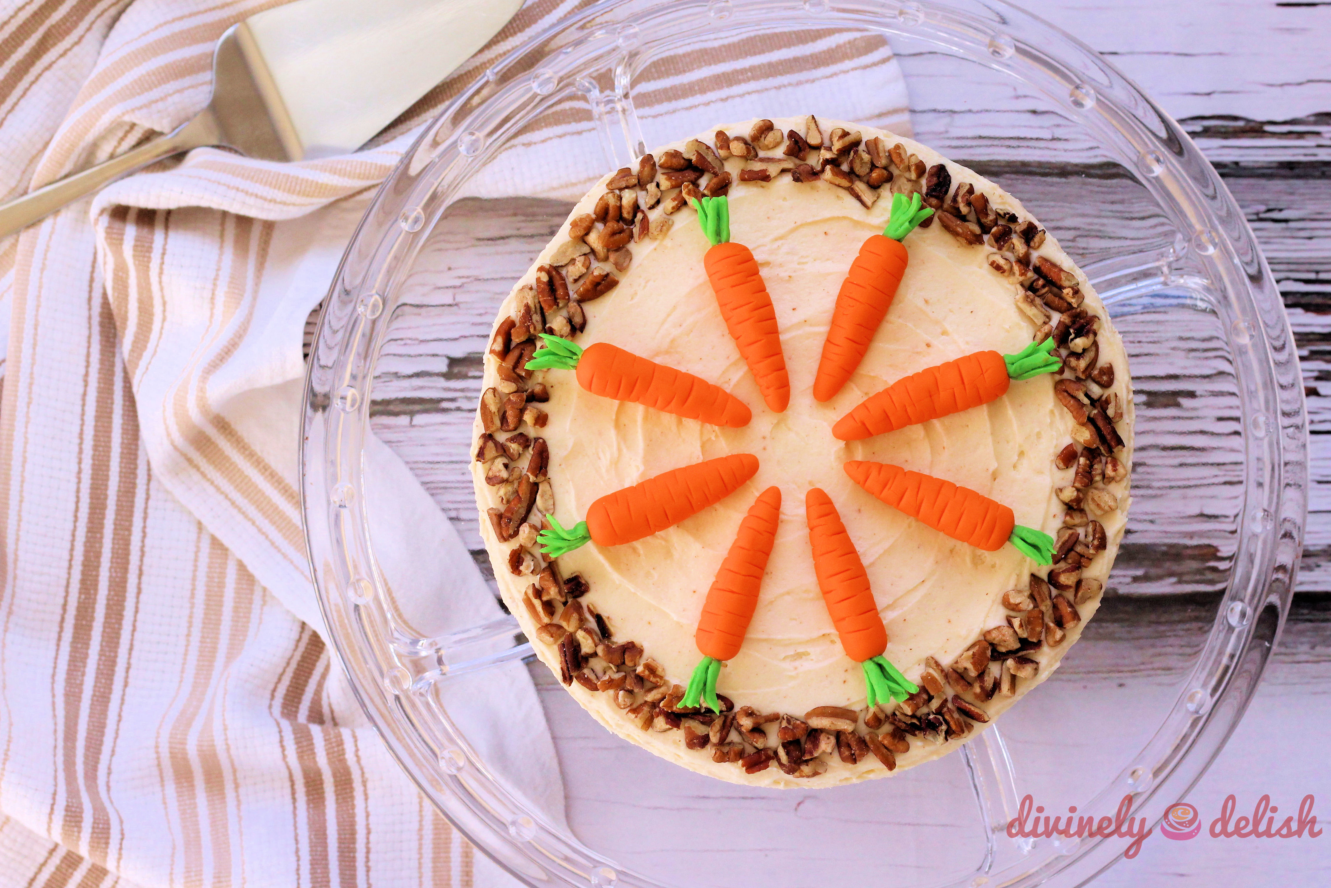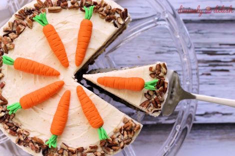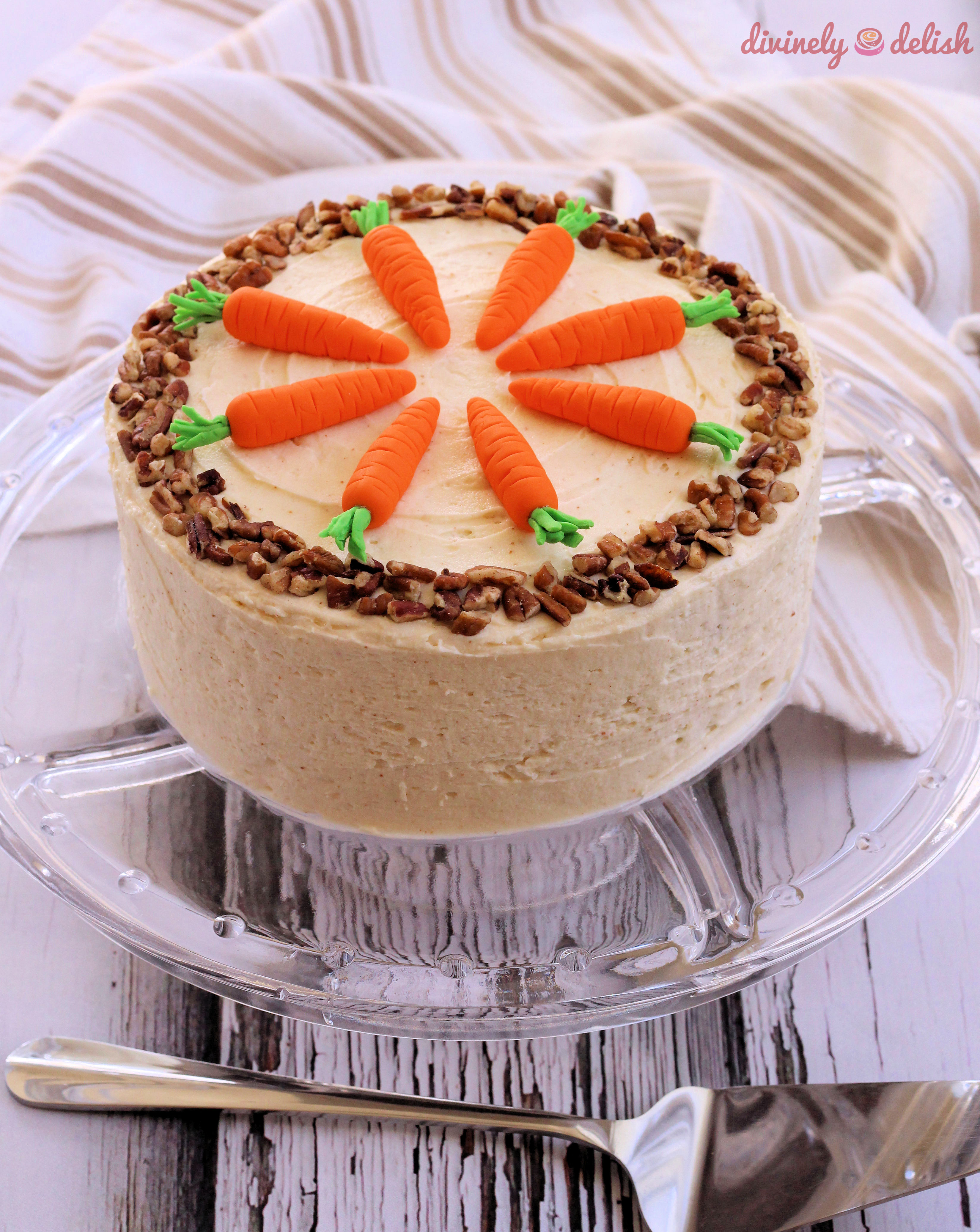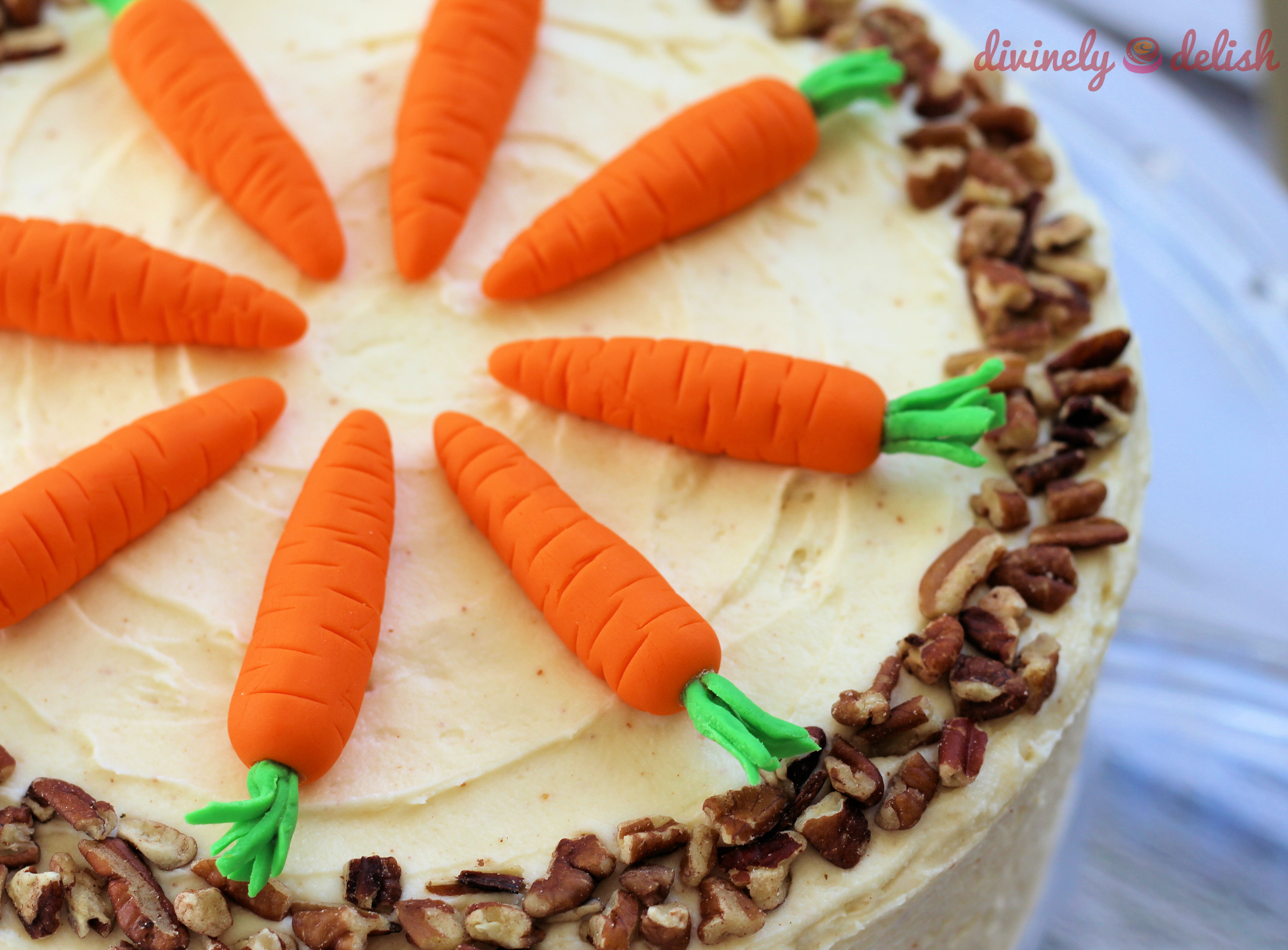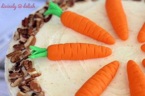 For decoration, I used fondant to make mini “carrots” and also some chopped pecans that I had left over from making the cake. If you have any frosting remaining, you can colour it and pipe on some buttercream “carrots”, or top with pineapple pieces, or maybe cover the sides with toasted sweetened shredded coconut…