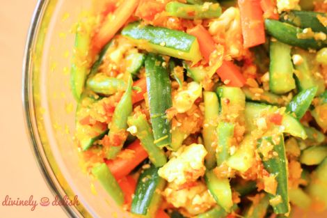 *Amounts are rough estimates. You can play around with the proportions of vegetables, although traditionally, Nyonya acar has a larger proportion of cucumbers. Cabbage can also be added (they will need to be blanched first).