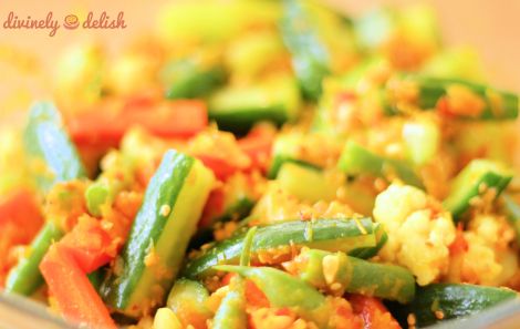 2) Preheat oven to 150 F. Rinse cucumbers, drain and set aside. Pat dry the rest of the vegetables (carrots, cauliflower and french beans) and spread out on a baking sheet and place in the oven for about 30 minutes.