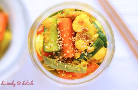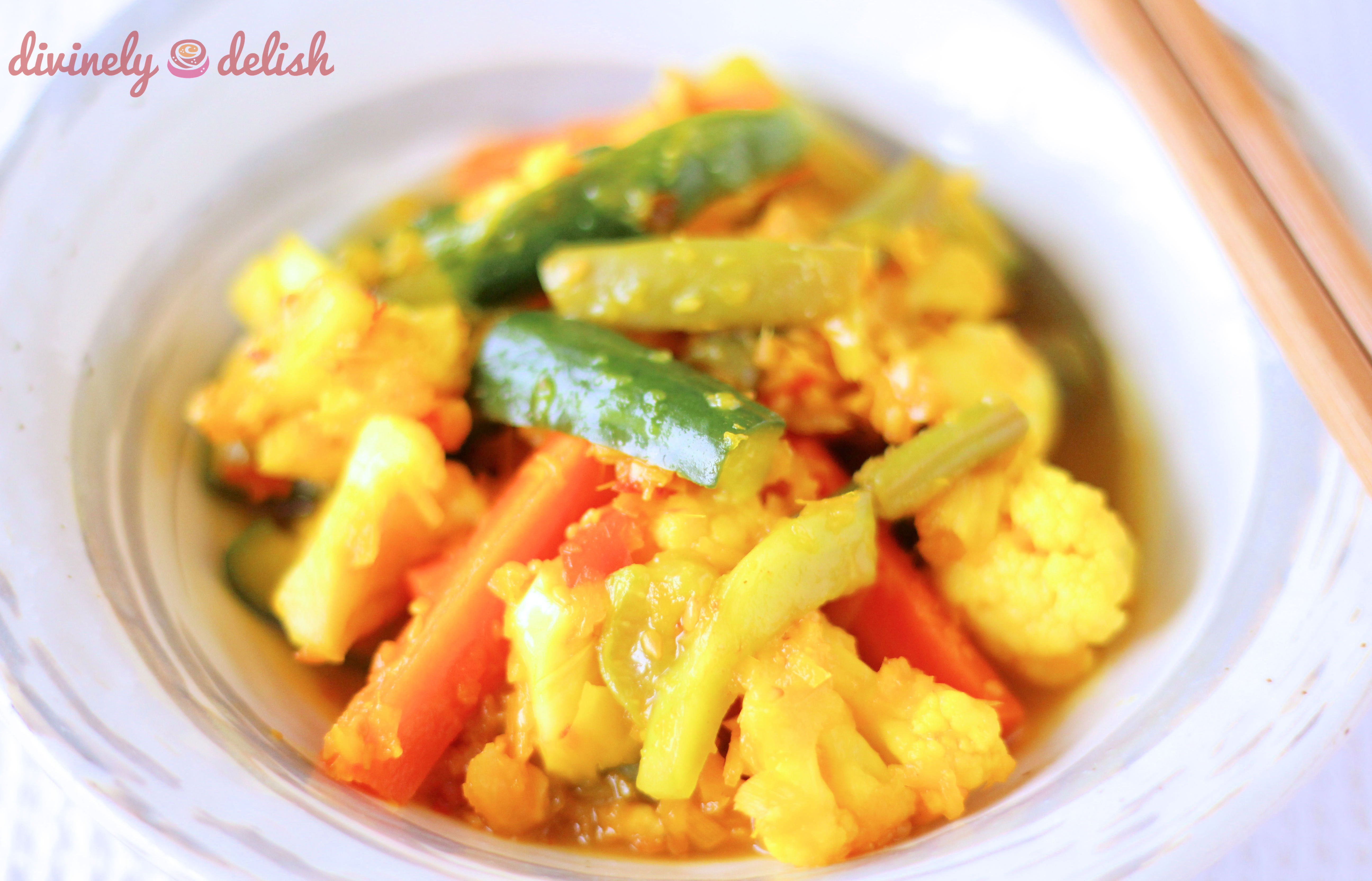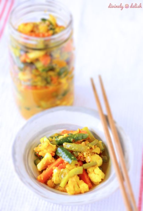In the meantime, it was my sister who actually tried and liked this simplified recipe for acar, and recommended it. Not only are all the ingredients readily available at supermarkets here, but surprisingly, this pared down version actually tastes really good!! In fact, one time I made it, I didn’t have rice vinegar, so I substituted with half white vinegar and half apple cider vinegar, and it was SO amazing! I only adjusted the amount of sugar from the original recipe, which was a little too sweet for my liking. With the decreased sugar, I find that it’s a little bland tasting initially, however, if you can manage to wait just until the next day (like all pickles, it gets better with time), the flavours balance out and it’s absolutely delicious!