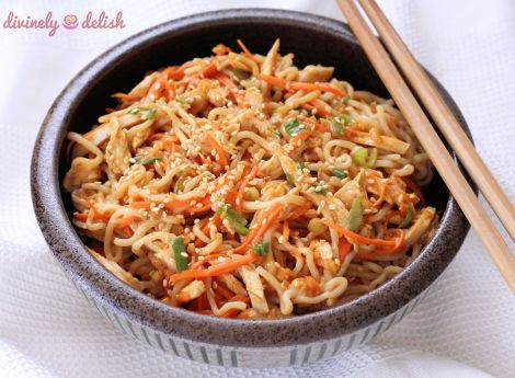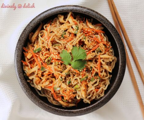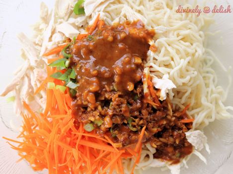 2. Place cooled noodles in a large bowl, add in shredded chicken, carrots and green onions. Pour the sauce over and thoroughly mix the noodles.
