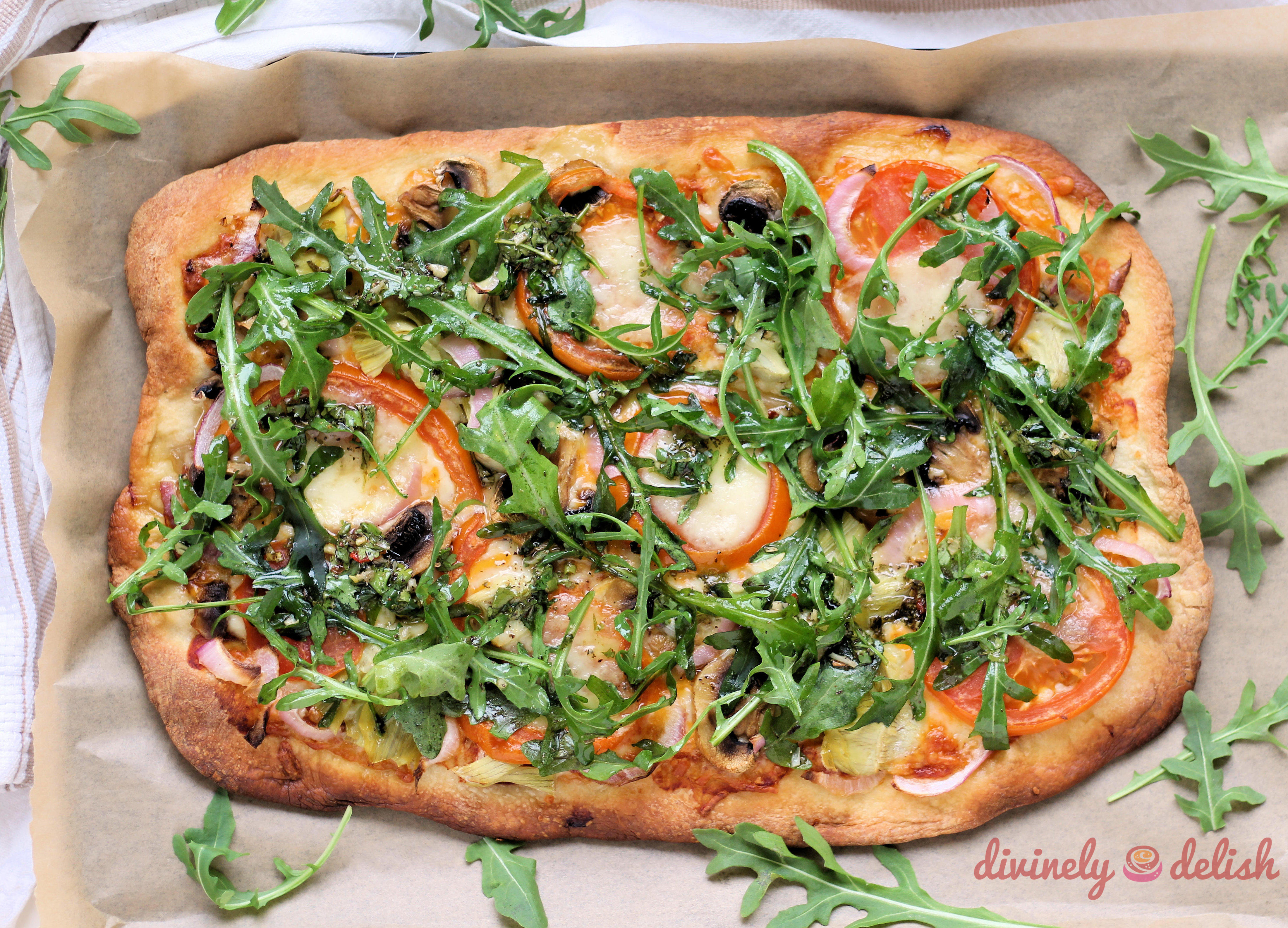10. When the pizza is done, remove from the oven and place the arugula on top.