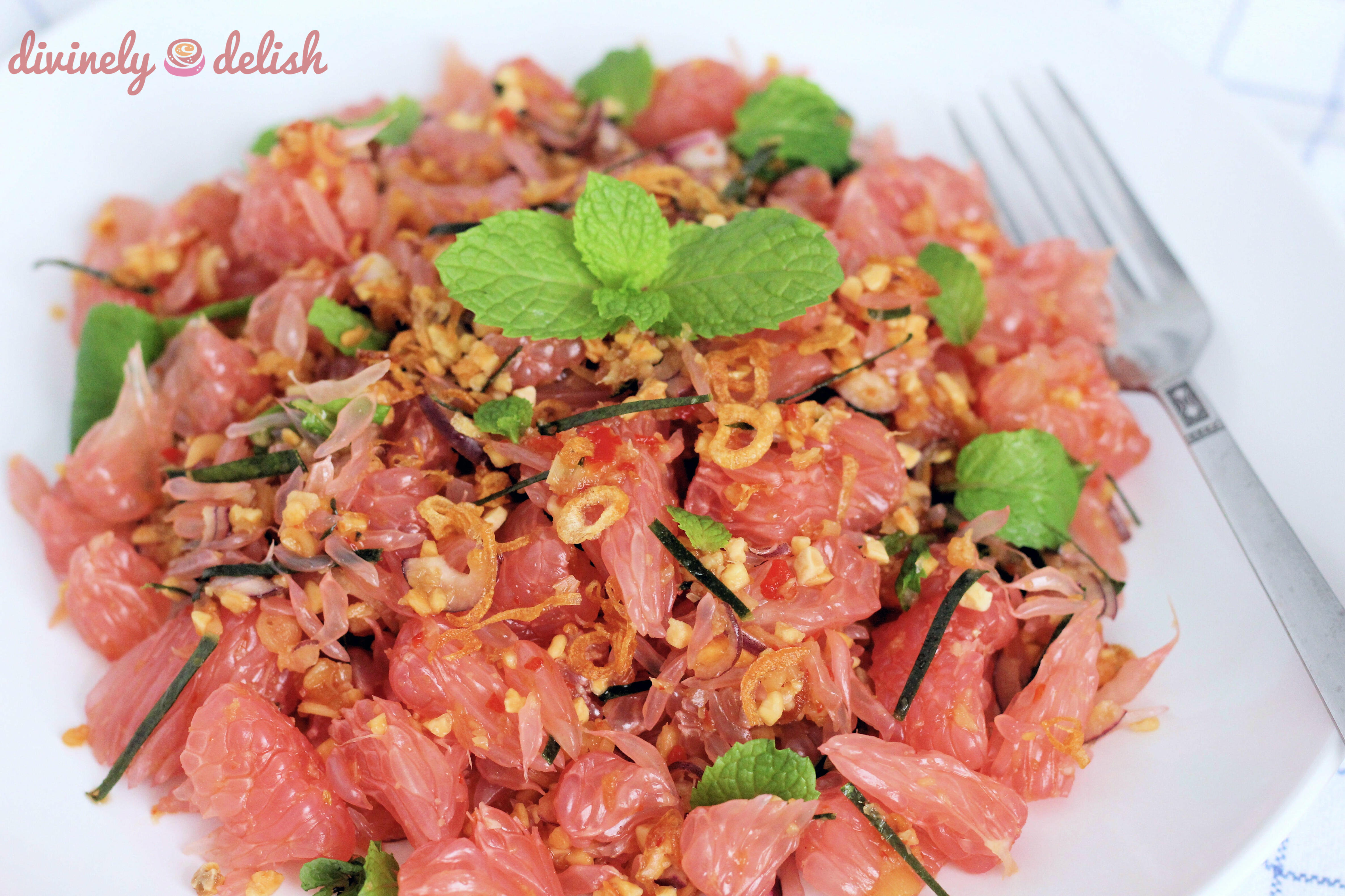 2) Place pomelo pieces and the rest of the salad ingredients into a medium bowl. Add the dressing, mix well.