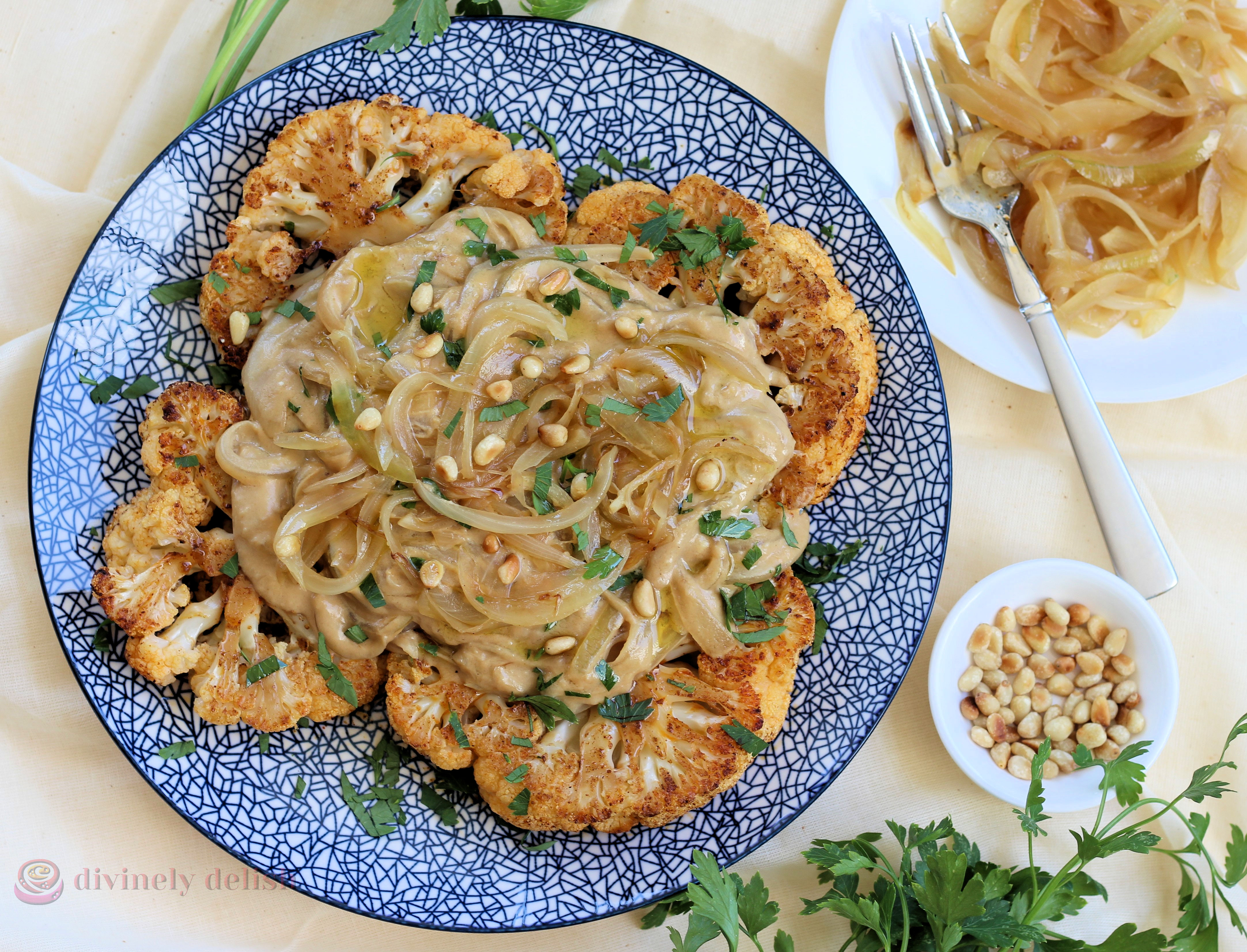 6. Place cauliflower steaks on serving plates, and pour tahini sauce on top.