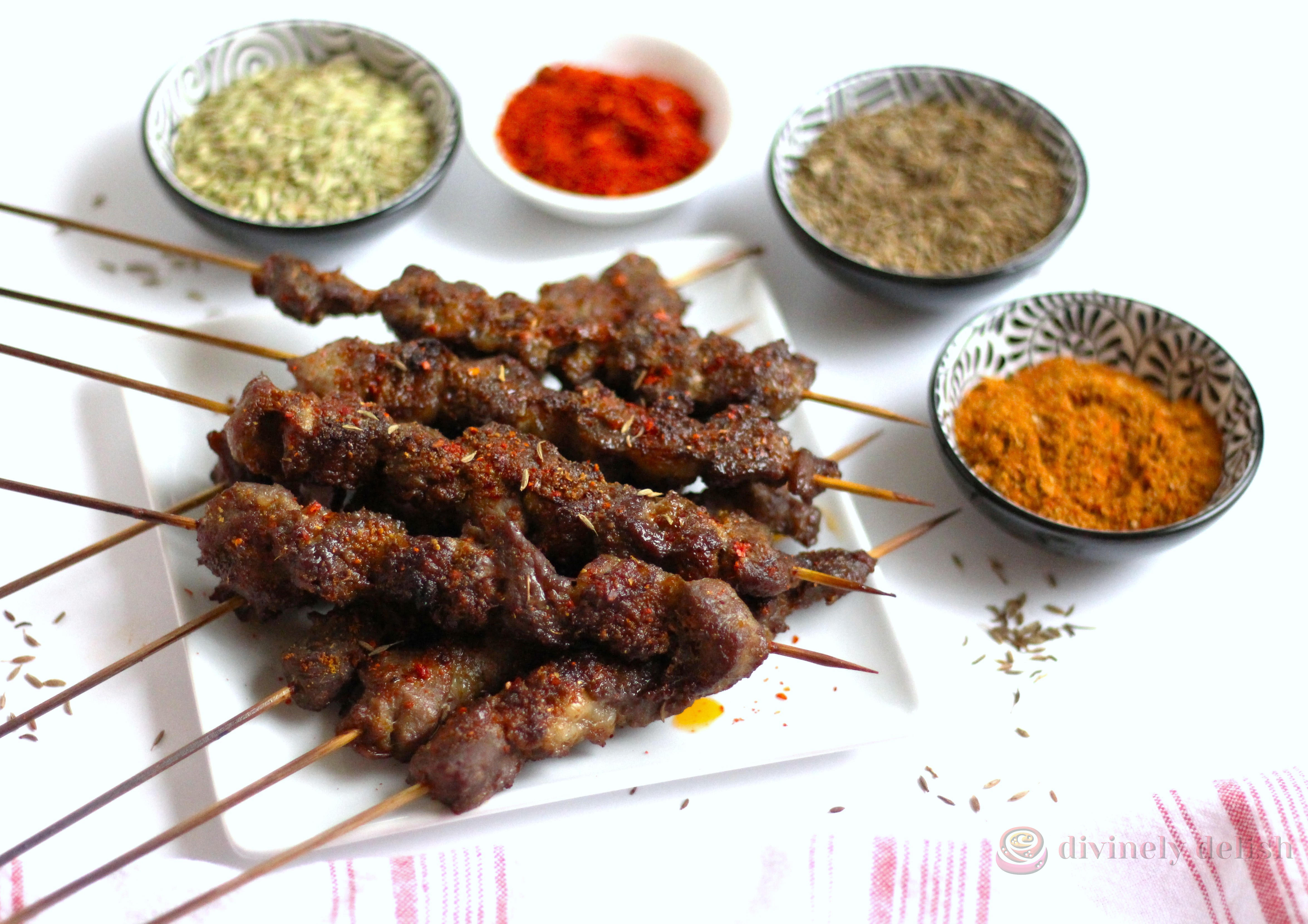 5. Place skewers on the grill (or arrange them on the rack of the baking sheet and place in the oven). When the skewers are just cooked but not browned yet (it’ll take about 10 minutes in the oven), generously sprinkle the spice mix all over the skewers, and then continue grilling and turning over the skewers until they are nicely browned on both sides.