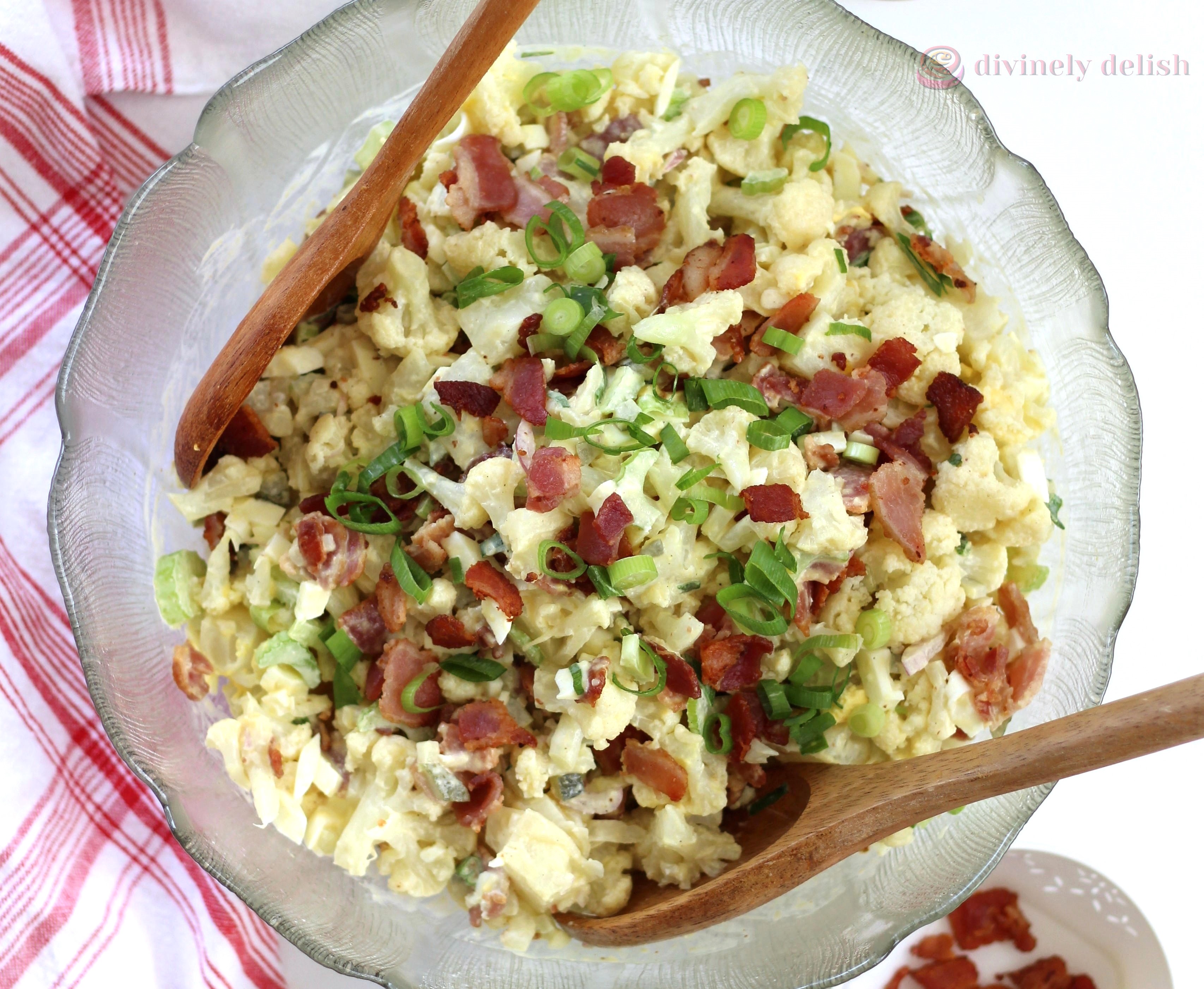 4. Place cooled cauliflower in a large bowl. Add in eggs, celery, shallot, pickles, green onions and bacon. Pour in dressing and toss to combine.